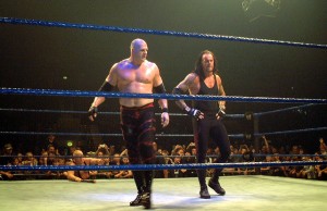 Kane and The Undertaker in the ring, unaware they’re about to be destroyed by Fit Finlay with his shillelagh. WWE SmackDown house show, 15 Oct 2007.